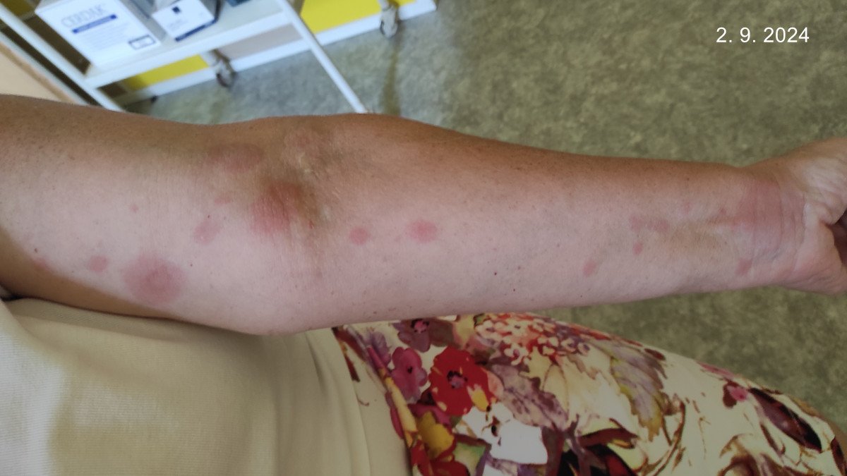 Dobrý den, po navýšení prednisonu byla zlepšena, IgE proti V-PNC zvýšené : 16,3 U/ml. Odeslána k dermatoložce (to ještě výsledky IgE nebyly), dermatoložka: urticaria alergica dif dg autoimunitní pro předchozím infektu, Xados i 2-0-2 s mírným efektem, proto doporučena Dasselta 1-0-1 a na noc Dithiaden 0-0-1, lokálně na projevy Gelargin gel 2x denně, přes to 1 x denně tekutý pudr, ko za 14 dnů (nyní má dermatoložka dovolenou). 16. 9. mi pacientka přichází projevy ukázat, zase se tvoří nové, zpočátku byly jen dopoledne a mizely, nyní se vytvoří, jsou i odpoledne, a zřejmě trvají i 2 dny. Připomínám, že se léčí s RS a revmatoidní artritidou, Prednison 7,5 mg denně bere chronicky zřejmě na RS. Fota z 16. 9. jsou přiložena k prvotní fotografii z 2. 9. Za cenné rady děkuji!