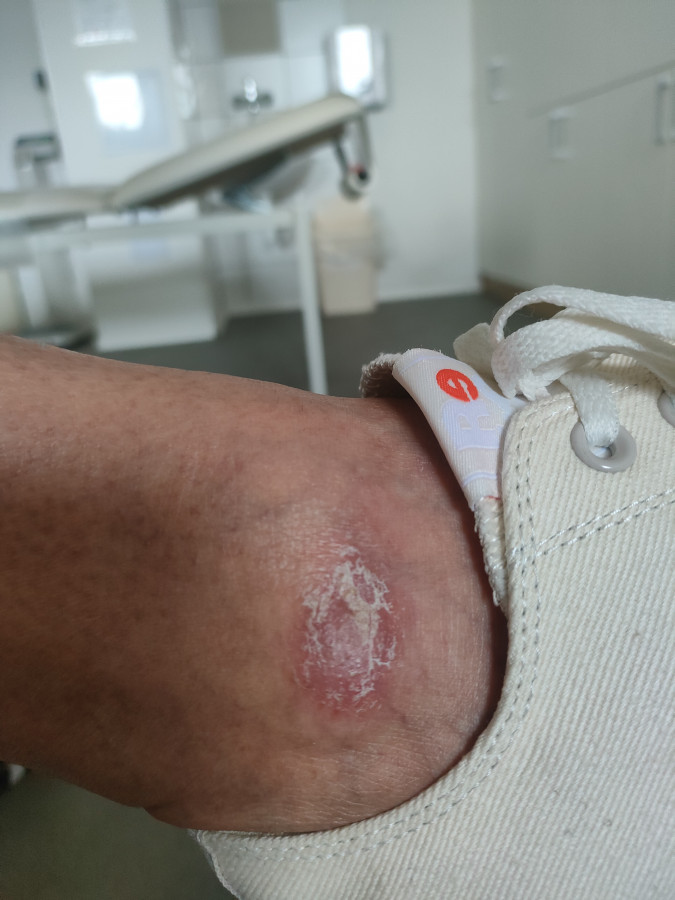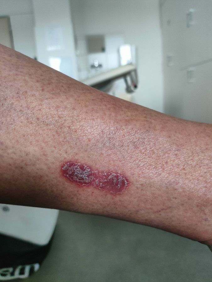 Dobrý den, prosím o radu, jak se postavit k nálezu (viz foto) - přetrvávající 4 měsíce na bérci a kotníku u 59leté ženy, z OA: prediabetes, hypercholesterolemie, st.p.excizi bazaliomu na P hýždi 2016. Paní udává, že nejspíše vzniklo po otlaku v kozačkách. Ložisko se mírně šupí, jinak se nemění. Jeví se mi jako mykóza, ale nemám zkušenost s vhodnými přípravky na tento druh zánětu. Děkuji.