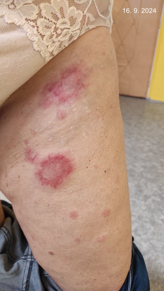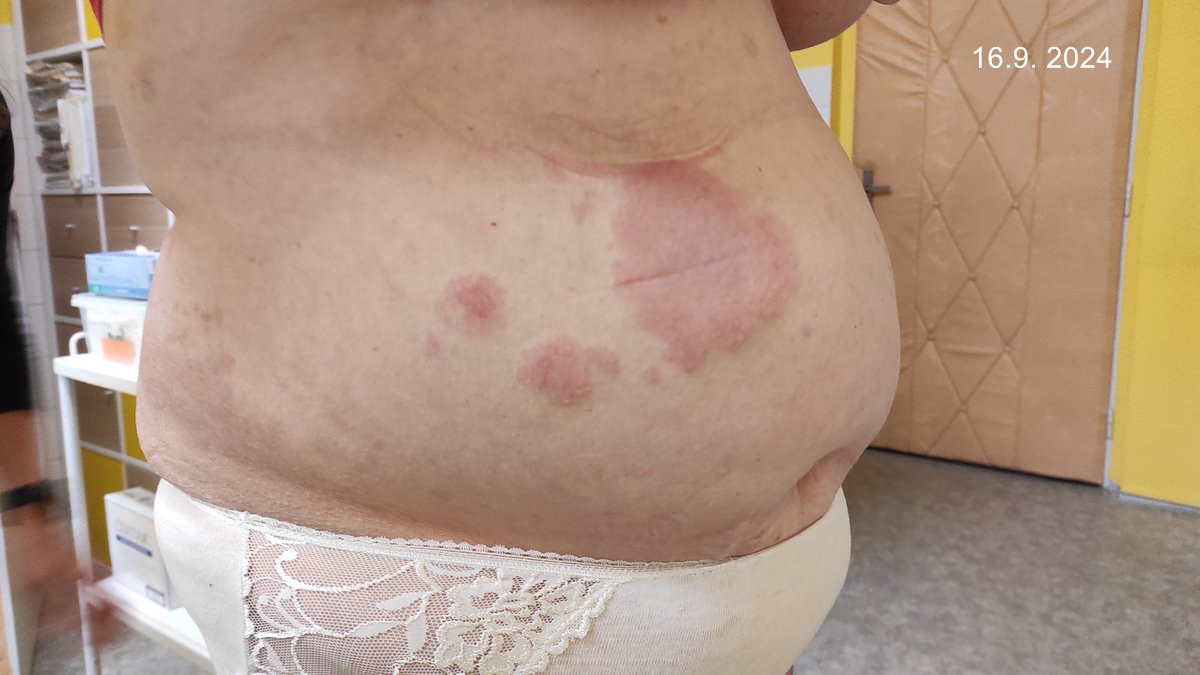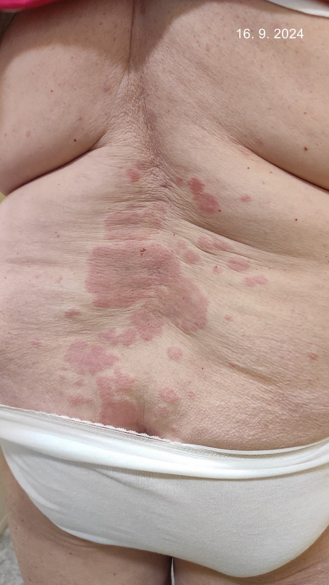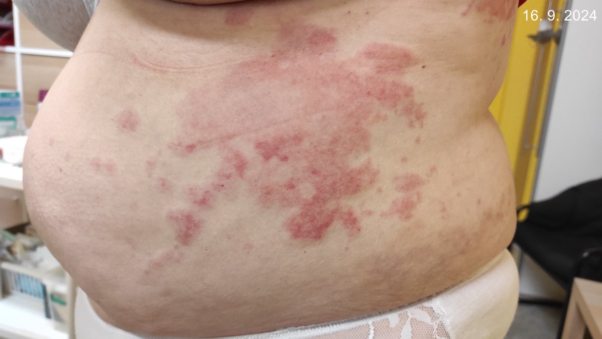 Dobrý den, po navýšení prednisonu byla zlepšena, IgE proti V-PNC zvýšené : 16,3 U/ml. Odeslána k dermatoložce (to ještě výsledky IgE nebyly), dermatoložka: urticaria alergica dif dg autoimunitní pro předchozím infektu, Xados i 2-0-2 s mírným efektem, proto doporučena Dasselta 1-0-1 a na noc Dithiaden 0-0-1, lokálně na projevy Gelargin gel 2x denně, přes to 1 x denně tekutý pudr, ko za 14 dnů (nyní má dermatoložka dovolenou). 16. 9. mi pacientka přichází projevy ukázat, zase se tvoří nové, zpočátku byly jen dopoledne a mizely, nyní se vytvoří, jsou i odpoledne, a zřejmě trvají i 2 dny. Připomínám, že se léčí s RS a revmatoidní artritidou, Prednison 7,5 mg denně bere chronicky zřejmě na RS. Fota z 16. 9. jsou přiložena k prvotní fotografii z 2. 9. Za cenné rady děkuji!