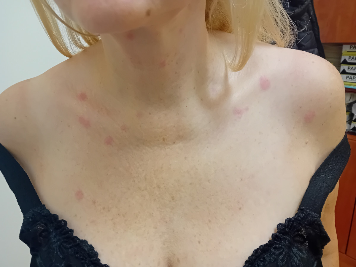 59-ti letá pacientka pozoruje 1,5 roku intermitentně různě velké erytémy, poprvé 8/2022 několik až splývajících erytémů v dekoltu. Jindy se objeví v obličeji nebo na boku. Většinou jsou to tyto lokalizace. Erytém mírně svědí, ale ne tak, aby si to musela škrábat. V erytému pociťuje horkost, ale kůže proteplená není. Minulý rok byla na kožním, kde susp. alergie, dostalal Zyrtec, zdálo se, že pomáhá. Ale k vymizení dojde i bez něho. K objevování erytému dochází na pár hodin, pak erytémy zase blednou. Zpočátku bylo vždy několik dnů bez objevení se erytému, nyní se vyskytuje skoro denně. Jiné problémy nemá. Již při výskytu potíží, které tehdy nezmiňovala, jsme 5/2023 dělali základní náběr krve, FW, KO+diff, kreatinin, ALT, GGT, minerály, to tehdy bylo v normě. Prosím o vyjádření.